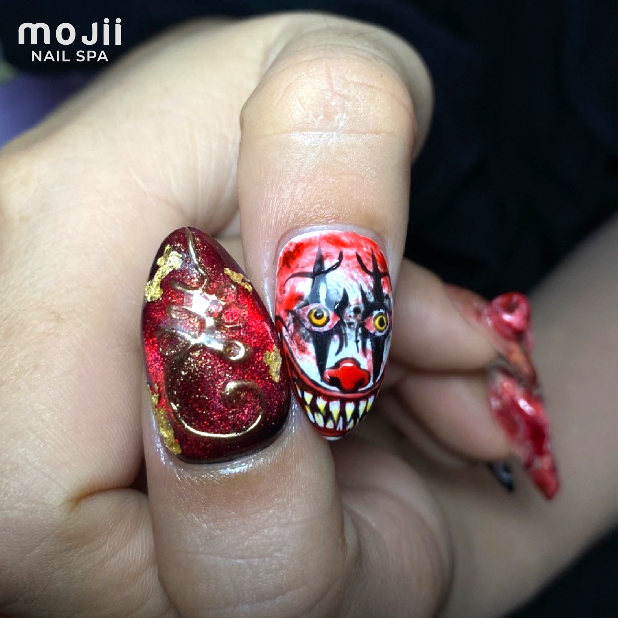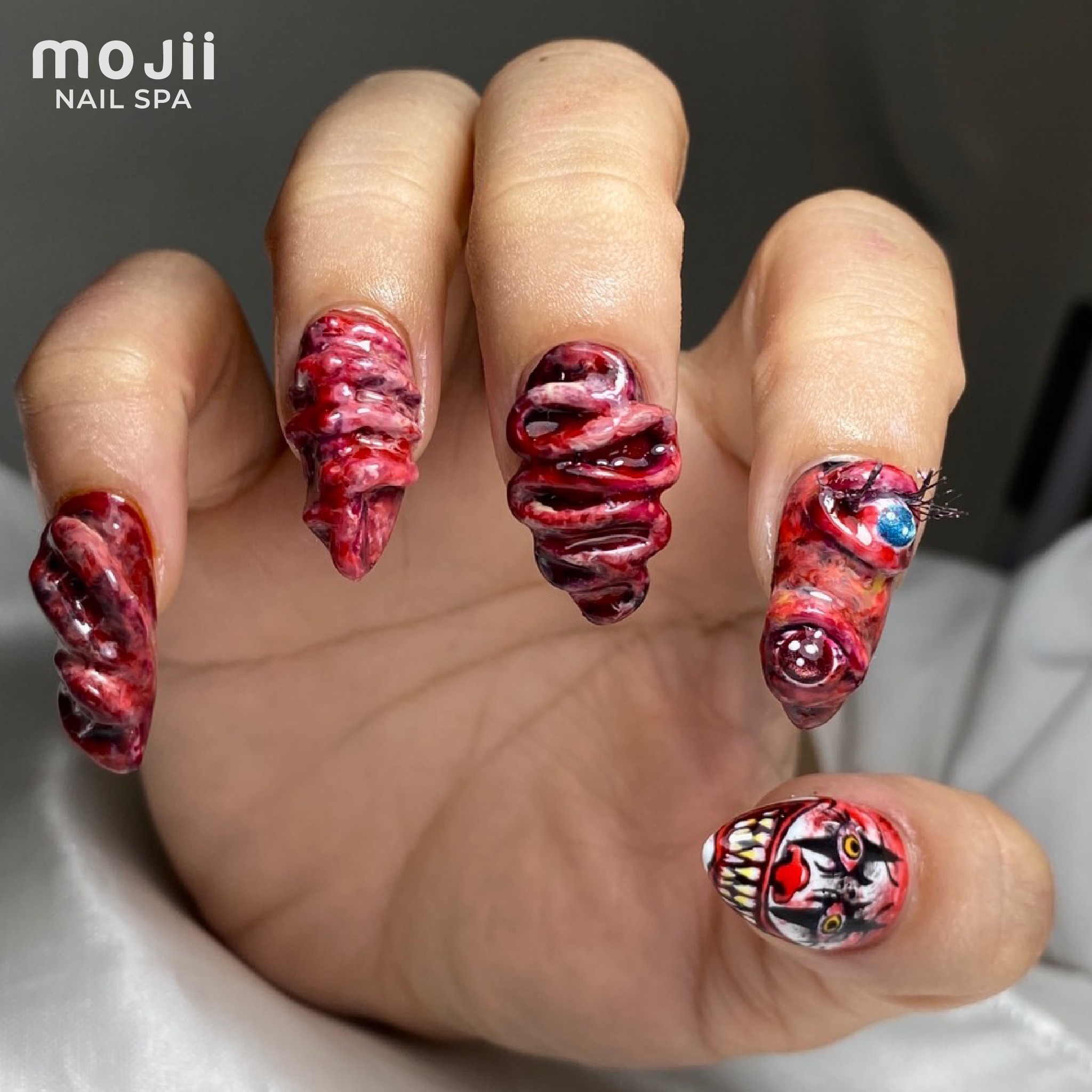 Welcome the spooky season with intricately captivating nail art! This highly artistic 3D Sculpture work meticulously creates stunning details, from the twisted textures of flesh to lifelike staring eyes, merged with demonic hand-painting and a deep, wine-red hue.